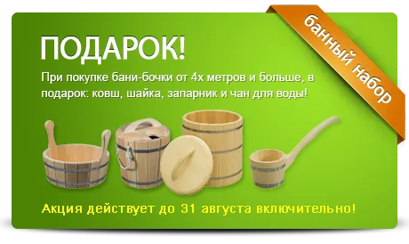 Купив у нас баню-бочку вам уже не нужно думать о тазиках и ковшиках, мы подготовили всё необходимое, чтобы вы могли в первый же день установки воспользоваться своей банькой! До 31 августа, при покупке бани-бочки от 4х метров и больше, в подарок: ковш, шайка, запарник и чан для воды!