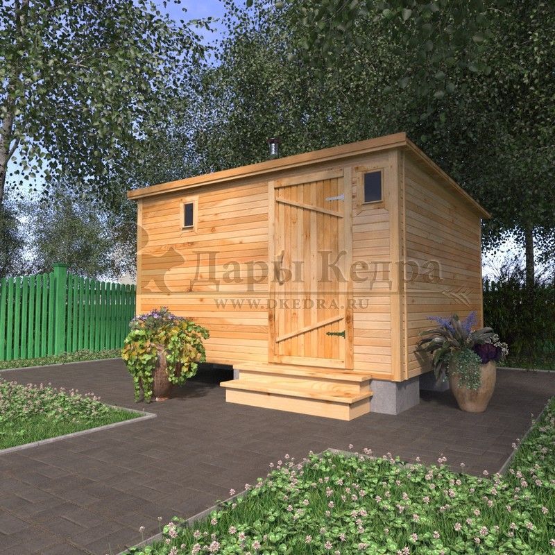 Это квадратная классическая модель бани с тремя отделениями: предбанником, моечной и парилкой. Для удобства пользования предбанник оснащен лавочкой и вешалкой. В моечной находится лавка и полочка из кедра. Парилка оборудована двухуровневым открытым полком и печью. За счет небольших размеров баня нагревается не более 30 минут. Каркасно-щитовую баню можно заказать как в готовом, так и в разборном варианте. В разборной модели готовые щиты из кедра быстро собираются в полноценное строение, что также позволяет исключить лишний строительный мусор. Такая баня не требует полноценный фундамент, поэтому при необходимости ее можно перенести в другое место.