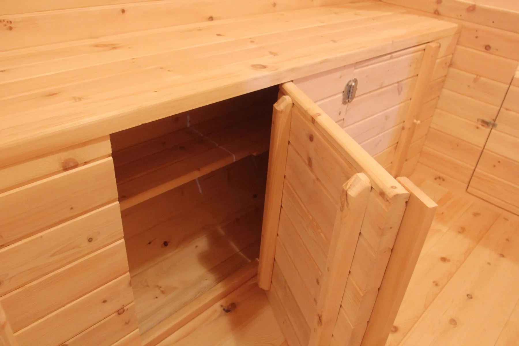 Это классическая прямоугольная модель бани с двумя отделениями: предбанником и парилкой, а так же удобной терассой. Предбанник оснащен лавочкой и вешалкой. Парилка оборудована двухуровневым открытым полком и печью. Время растопки такой бани не превышает 30 минут. Каркасно-щитовую баню можно заказать как в готовом, так и в разборном варианте. В разборной модели готовые щиты из кедра быстро собираются в полноценное строение, что также позволяет исключить лишний строительный мусор. Такая баня не требует полноценный фундамент, поэтому при необходимости ее можно перенести в другое место.