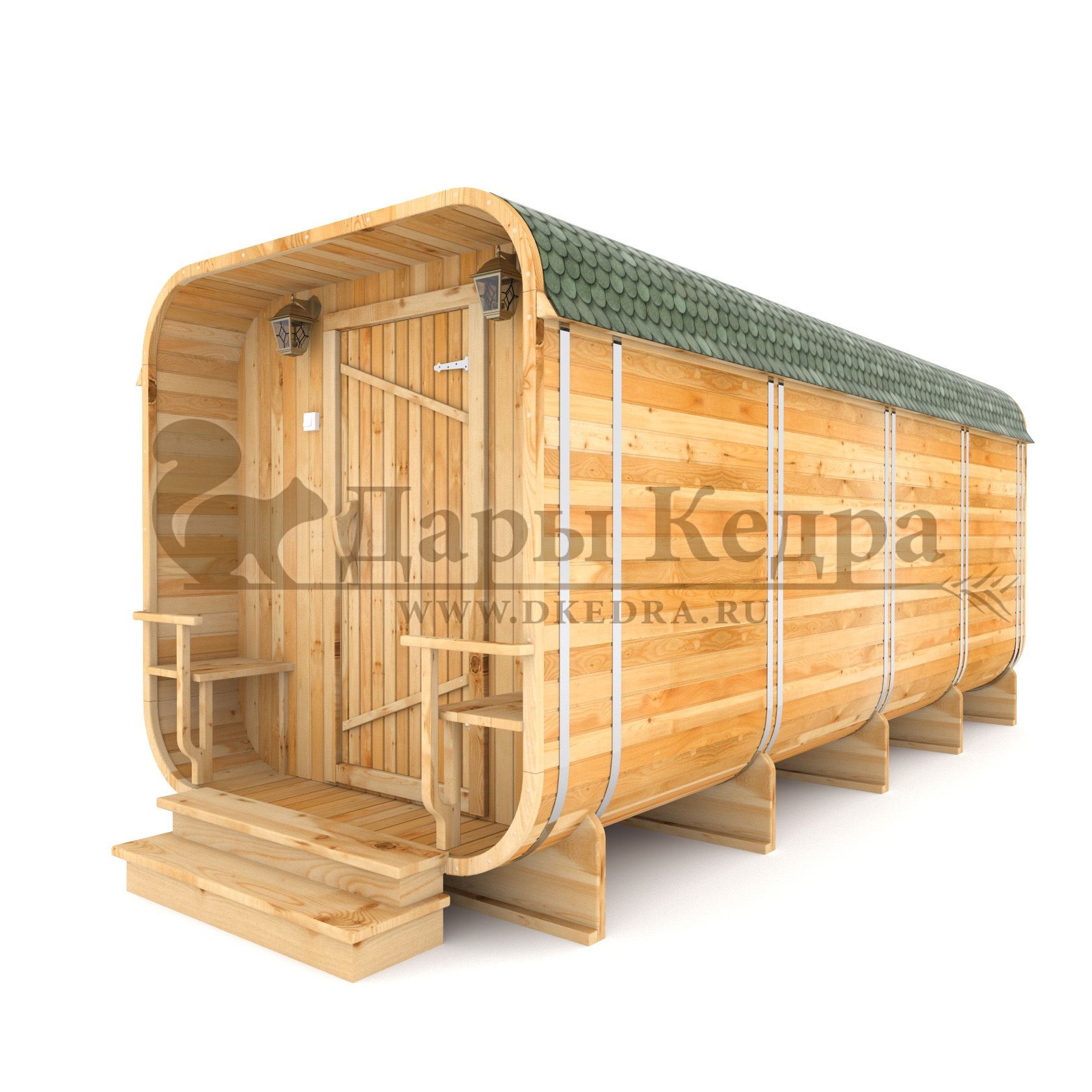 Компактный однокомнатный домик подойдет для дачного использования в теплое время года или обустройства загородных баз отдыха. Домик оборудован двумя лежаками из кедра, между которыми пользования можно поставить откидной столик. Для удобства пользования кемпинг дом можно укомплектовать верандой с лавочками или козырьком.