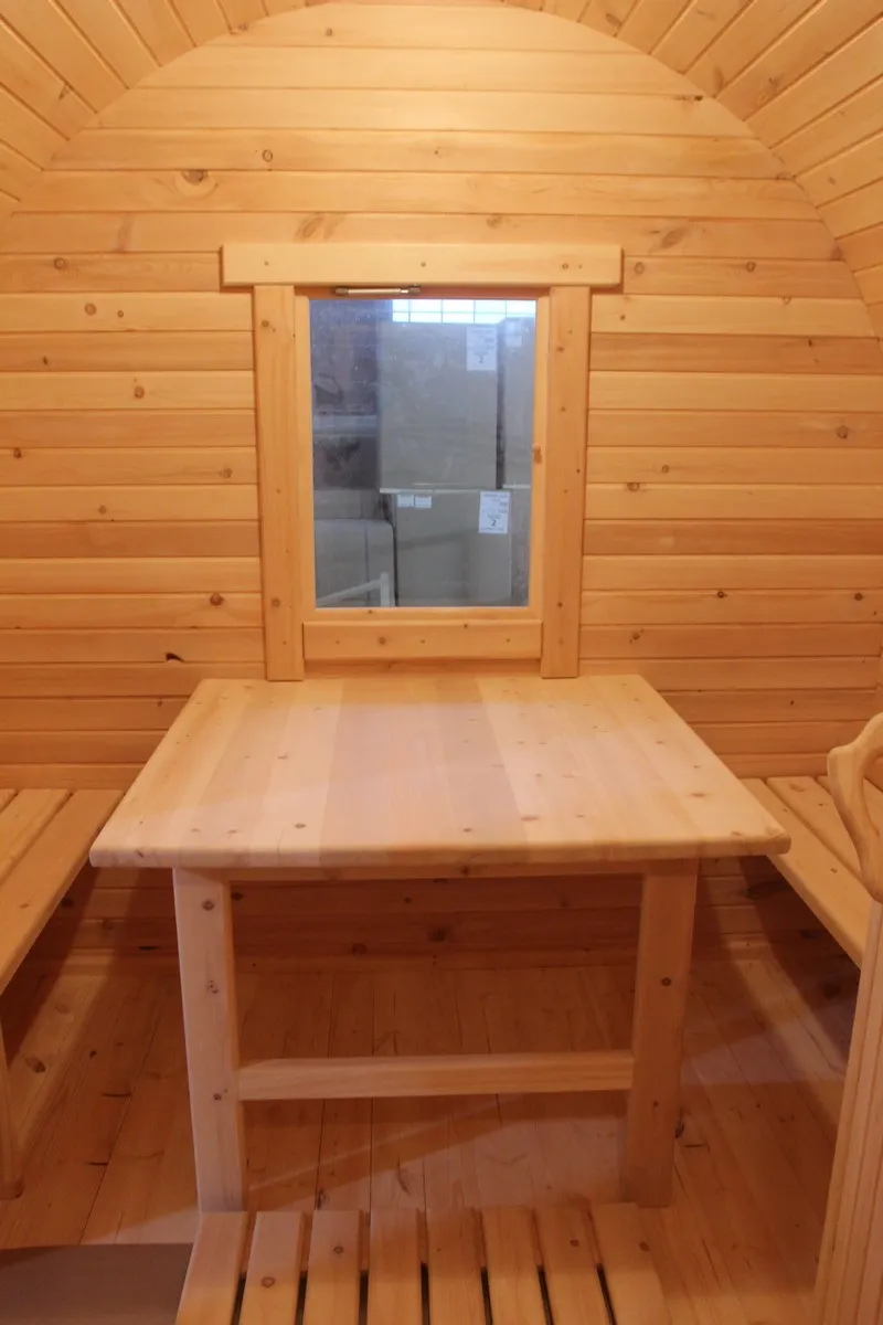 Окна из закаленного стекла (панорамное), можно разместить, как в парилке, так и в комнате отдыха. Может быть установлено только на торцевых (ровных) стенах бани. За дополнительную плату возможно сделать стекло бронзированным.