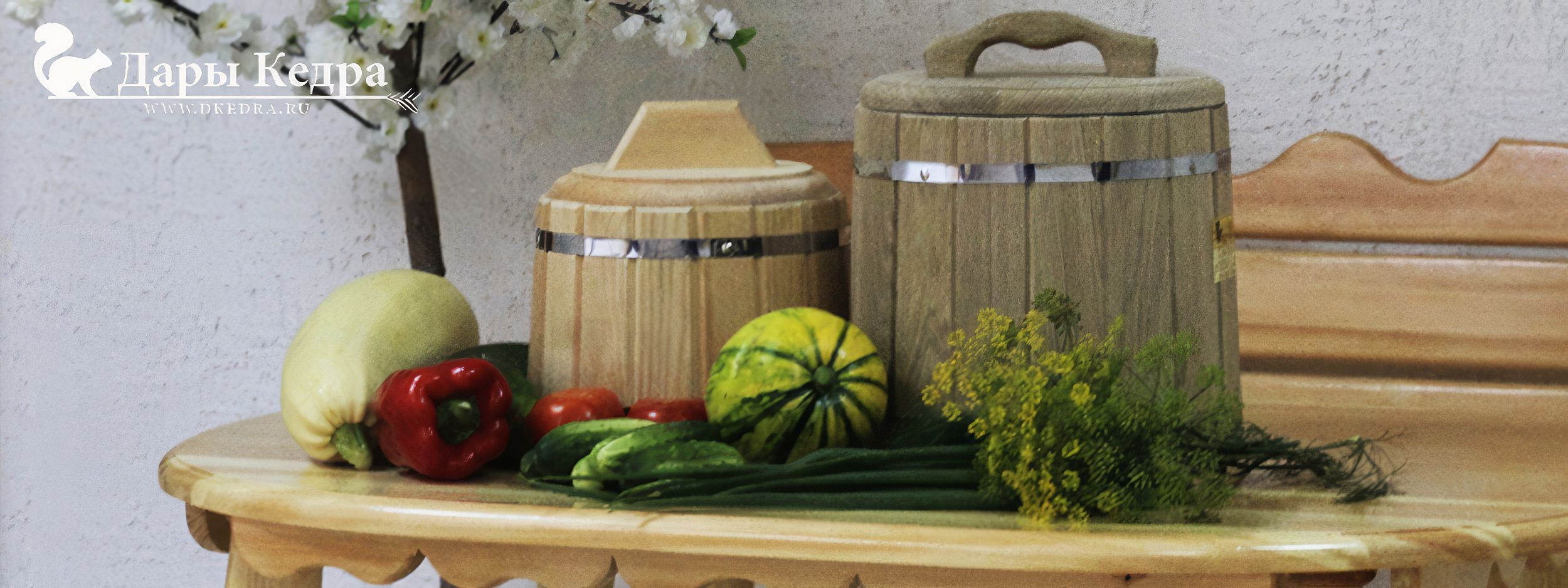 • Кадушка из кедра подойдет для приготовления большинства продуктов: огурцов, помидоров, капусты, грибов, арбузов. В ней соления сохраняюв вкус, свежесть, а также наполняются фитонцидами кедра.